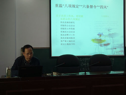党委书记、局长周英杰给全体与会人员上了题目为《强化政治担当,把全面从严治党主体责任落到实处》的廉政党课,周局长利用课件,图文并茂的从五个方面阐述了为什么要深刻领会"两个责任"的精神、两个责任的具体涵义和如何落实两个责任,分析了当前反腐败斗争的新形势,重温了"八项规定""六条禁令""四风",并明确提出党员干部要明规矩、尊纪律、守底线,不"踩雷"、不"触电",真正做到心中有党、心中有责、心中有民、心中有戒。